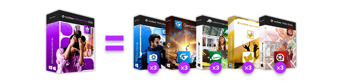 ACDSee Ultimate Pack 2026 includes: ACDSee Photo Studio Ultimate 2026 x3*, Gemstone Photo Editor 15 x3*, LUXEA Pro Video Editor 8 x3*, ACDSee Video Converter Pro 5 x3*, and ACDSee Photo Studio for Mac 11 x3*.